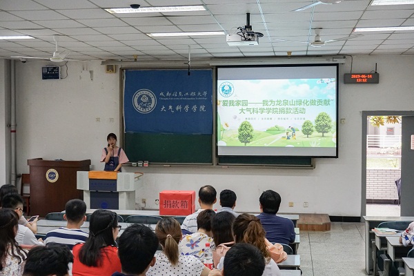 【本网讯】  6月14日中午,大气科学学院在航空港校区1106教室举行“爱我家园,我为龙泉山绿化做贡献”捐款活动。学校党委副书记马洪江、大气科学学院的领导、部分老师以及学生干部代表参加了活动。