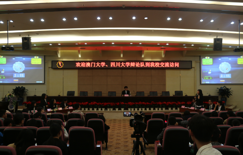 【本网讯】赋有凌云之称,辩有雕龙之声,古有鹅湖之会,濠梁之辩,今有澳蜀之争。3月26日,我校迎来了澳门大学、四川大学辩论队同学到的友好交流访问。由校学生会学习部承办的辩论交流赛在航空港校区国际会议厅正式举行。