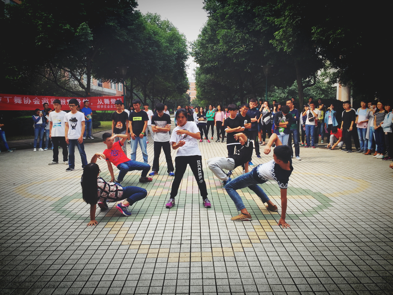 当日中午,一场欢快的拉丁舞为本次活动拉开帷幕。舞者那妙曼轻盈的舞姿,热情洋溢的微笑,吸引了众多同学驻足观看。随着优雅音乐的结束,另一动感摇滚的音乐再次响起,来自街舞社的同学们带来了帅气干脆的舞步。高难度的动作,再配合极具现代感的音乐,让人感到一种独特的青春活力。时而变化的动作让快闪队伍成为校园中一道靓丽的风景线,现场的同学都被这欢快的氛围所感染,现场更是爆发了一次又一次的惊呼,尖叫。驻足的行人也不停的按下快门,用图像记录这样一个充满热情的时刻。