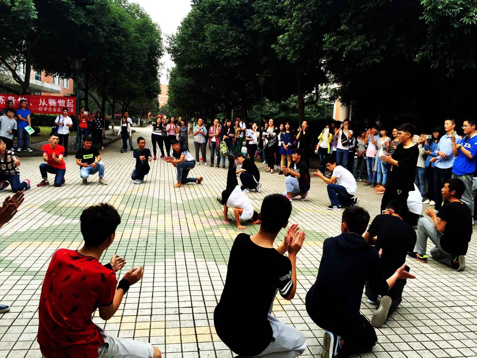 【本网讯】为响应共青团中央提出的“走下网络、走出宿舍、走向操场”的号召。10月20日,由校学生会主办,学生街舞协会,学生拉丁舞协会协办的校园快闪活动在四栋教学楼中央十字路口震撼上演。
