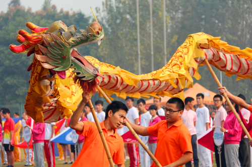 入场仪式结束后,进行了精彩纷呈的节目表演,体育部的龙狮翻滚、大刀武术、杂耍篮足球、穿花跳绳、杂技自行车、舞动空竹、健美运动舞等,展示了我院近年来体育教学改革的丰硕成果,2013级国防生警卫拳表演展示了我院一道亮丽的国防绿,跆拳道节目表演打出了“成于大气、信达天下”和“预祝升大成功”的标语,展现了成信学子良好的精神风貌和对学院美好的祝愿。