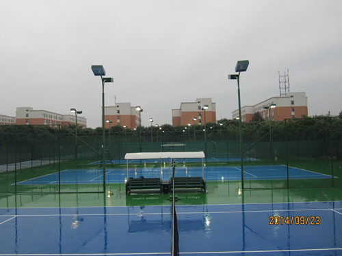 网球场地改建工程于2014年2月24日完工,该工程改建前为排球场,原设计场地做法与网球场地做法存在较大差异,原场地伸缩缝过多,地面存在不均匀沉降,在铺装沥青时大型机械设备入场,对原基础有一定影响,所以局部面层出现了裂缝和淌水,经建设工程工作小组与施工方共同商议决定,为满足教学,先将场地移交使用,将裂缝处理改到暑假天气状况较好的时候进行。裂缝处理工作在暑假如期进行,并于2014年9月22日完成,同时还完成了网球场地48盏专业照明灯具的采购、安装以及管线铺设工程。
