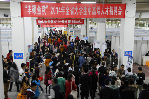 [本网讯] 11月8日,“丰硕金秋”2014年全省大学生中高端人才现场招聘会在成都信息工程学院航空港校区体育馆举行。260余家企事业单位提供了包括博士、硕士和本科生岗位5500余个,来自省内10多所高校的4000余名毕业生进场求职。据悉,以硕士、博士毕业生为重点的中高端人才交流盛会,在我省尚属首次。