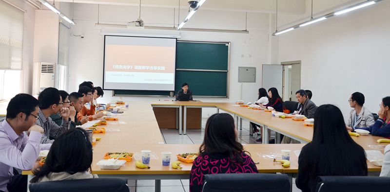 陈锋老师深入具体的介绍起到了抛砖引玉的效果,教师们分别从自己教授课程的特点出发对课程教学改革进行了讨论和交流。计算中心的张伟利和朱烨老师与在座教师探讨了公共基础课程实验操作方式的改革;计算机学院的文武老师就多样化的考核方式与在座教师进行了探讨;外国语学院的饶国慧老师就课程设计和学生配合完成情况阐释了自己体会和观点。各位老师各抒己见,讨论热烈。