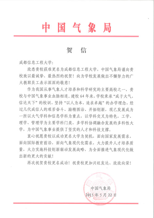 【本网讯】2015年4月28日,教育部批准我校正式更名为云博体育,中国气象局、国家统计局、中国人民解放军第二炮兵部队政治部、省内外兄弟高校、友好单位、政府机关向我校发来贺信70余封,祝贺我校更名成功。