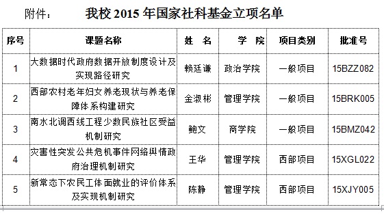 【本网讯】日前,2015年度国家社科基金项目立项文件已正式下发,我校共有5项国家社科基金项目正式立项,立项总经费100万元。其中一般项目3项,西部项目2项。分别为管理学院3项,政治学院1项,商学院1项(详见附件)。据悉,我校此次获批立项数位居全省省属高校第三。在此,也特向精心组织申报的各相关单位及申报者表示衷心感谢!