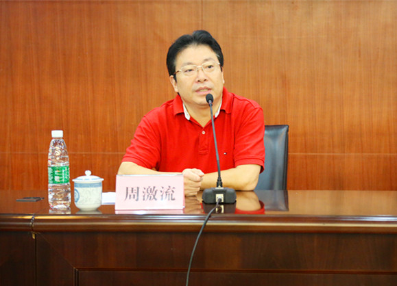 周激流代表全校师生对2015级硕士研究生新生表示热烈的欢迎和衷心的祝贺。周激流详细介绍了学校的现状,并就学校的历史沿革、办学规模、就业情况、服务国家地方情况和近期取得的成绩逐一进行了介绍。他希望研究生新同学们能在优美的校园环境中和优良的学科土壤上茁壮成长。他代表全体研究生导师向研究生新生提出两点要求:一是做好人,孝敬父母、遵守社会公德、尊敬老师、爱护同学、热爱劳动,做一个全面发展的人。写好“人”字是研究生学习生活的首要任务,全面提升自身各方面的能力和素质,才能最终脱颖而出实现人生理想。二是做好学问,研究生要在导师的指导下制定个性化的个人培养方案,导师对于不同学习背景的学生要因材施教。他希望同学们在学习研究中做好四个一:制定一个完整的三年学习计划,每年精读一本所学专业的专业著作,每年学习一篇研究领域的前沿概论,每周研读一篇专业方面的文献。日积月累,学有所成,学以致用。