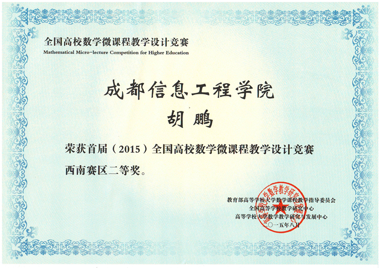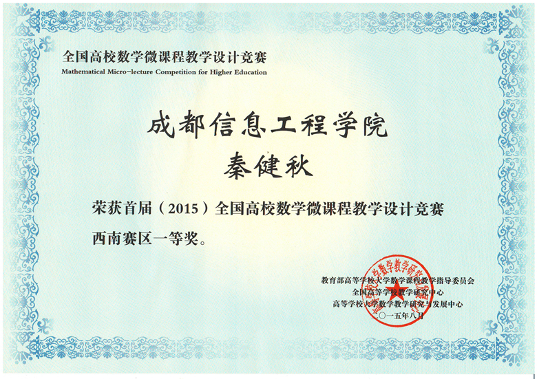 首届(2015)全国高校数学微课程教学设计竞赛分为赛区初赛和全国决赛两级,在赛区初赛中有来自四川大学、重庆大学、西南财经大学、电子科技大学、云博体育、云南大学、云南财经大学、贵州大学、贵州师范大学等的高校教师参加高等数学、线性代数、概率论与数理统计三门课程的比赛。我院组织的4位教师参加了比赛,秦健秋老师的《高等数学》获一等奖、胡鹏老师的《经济数学》获二等奖。