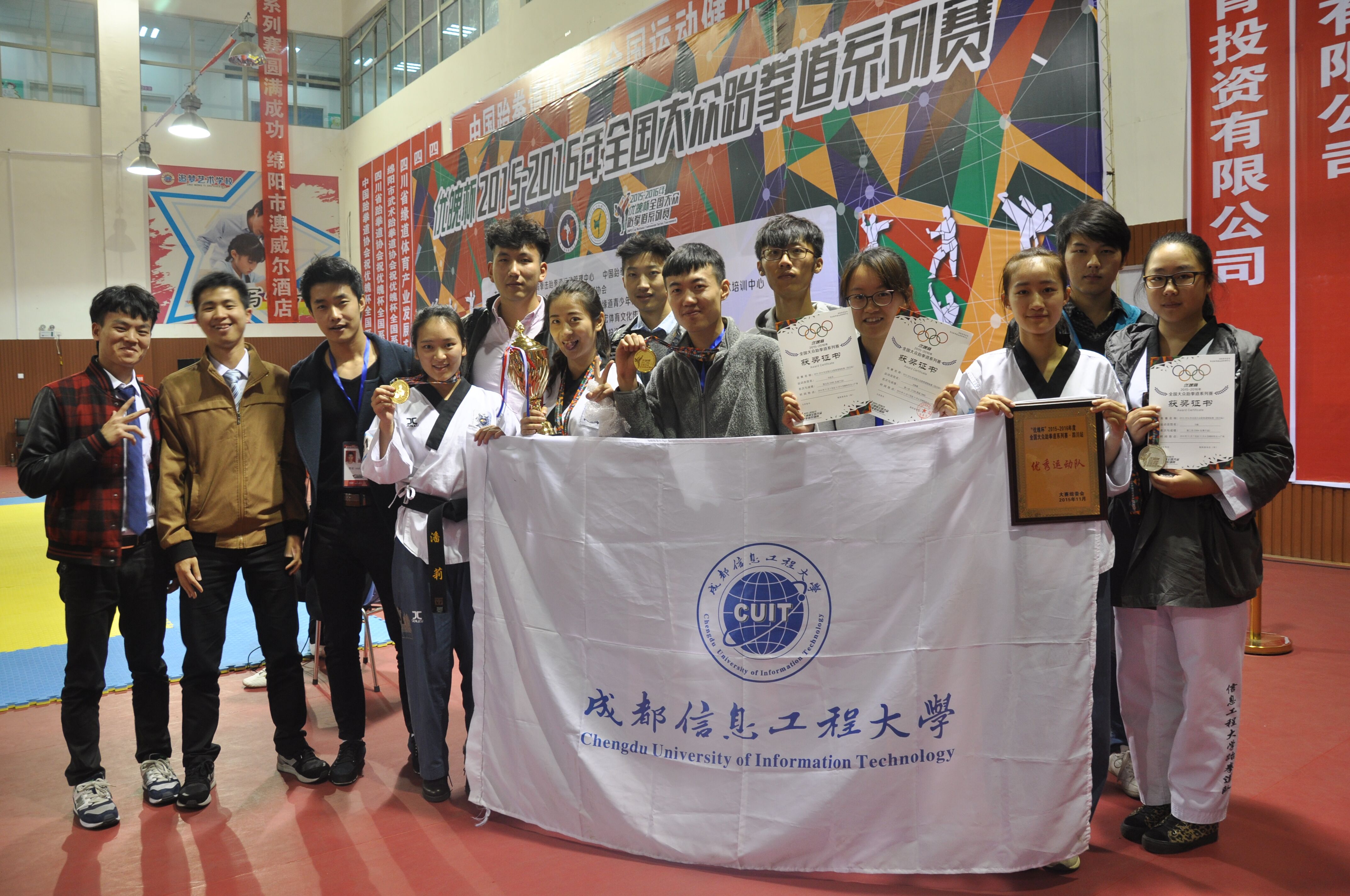 历经两天的激烈角逐,我校运动员不负众望,再创佳绩。大气科学学院吴雨思、资源环境学院潘莉、控制工程学院万庆兰获女子团体品势冠军,电子工程学院何修建获男子70公斤级冠军,应用数学学院李世勋获男子60公斤级第5名,商学院马敬、向亚灵获个人品势亚军。另外,李继涛、杨 果、韩濡翼作为裁判参与组织比赛。我校代表队更被中国跆拳道协会评为优秀运动队。