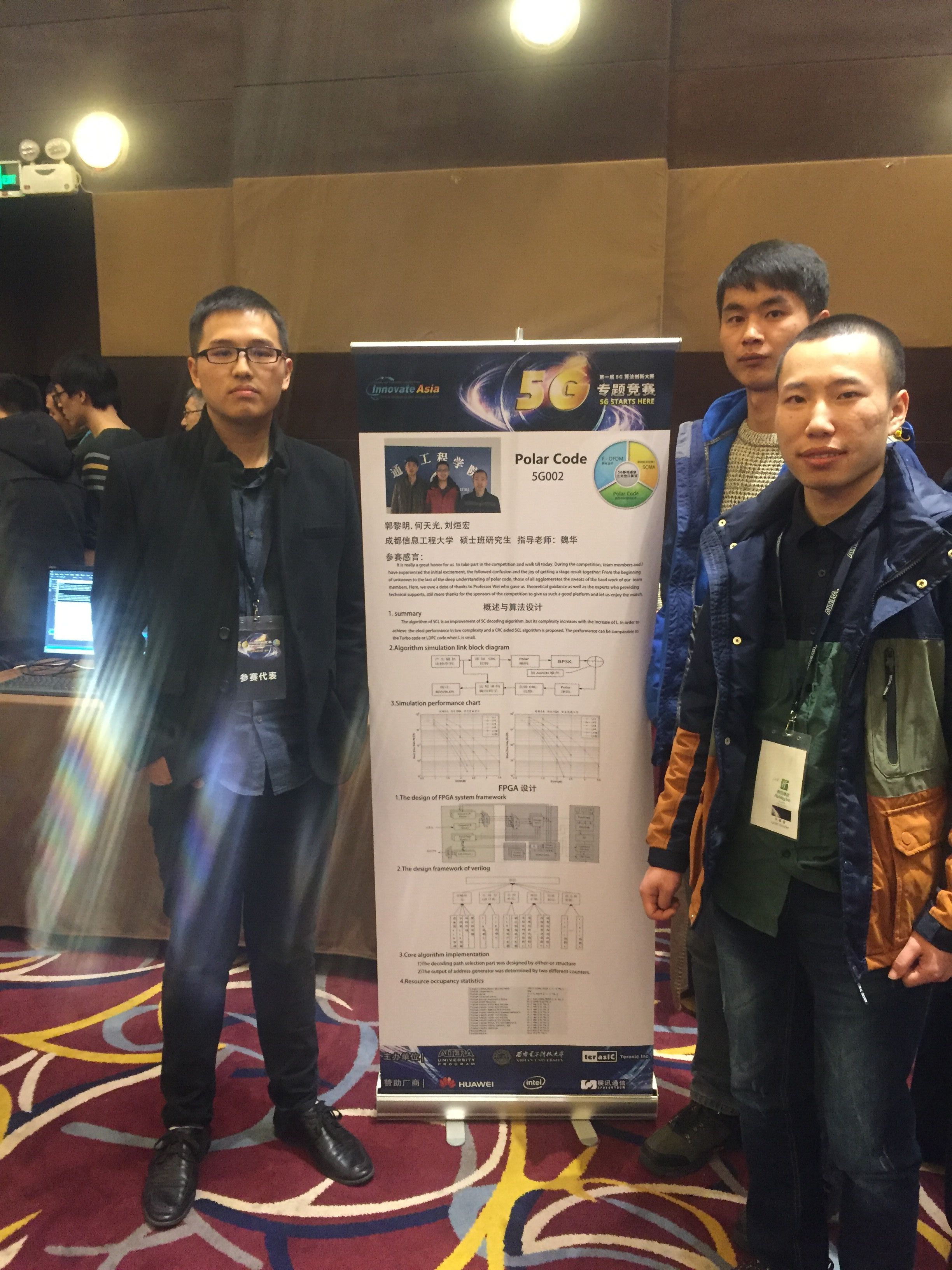 我校通信工程学院研究生二年级学生何天光,郭黎明,刘烜宏,由魏华博士和李蠡博士任指导老师,并组成团队,选择Polar Code为赛题参与这次大赛。经过七个多月的努力,他们成功进入全国仅有30支队伍入围的决赛(我校参赛队是唯一一支来自二本院校的团队),并最终取得“优秀算法仿真设计奖”。