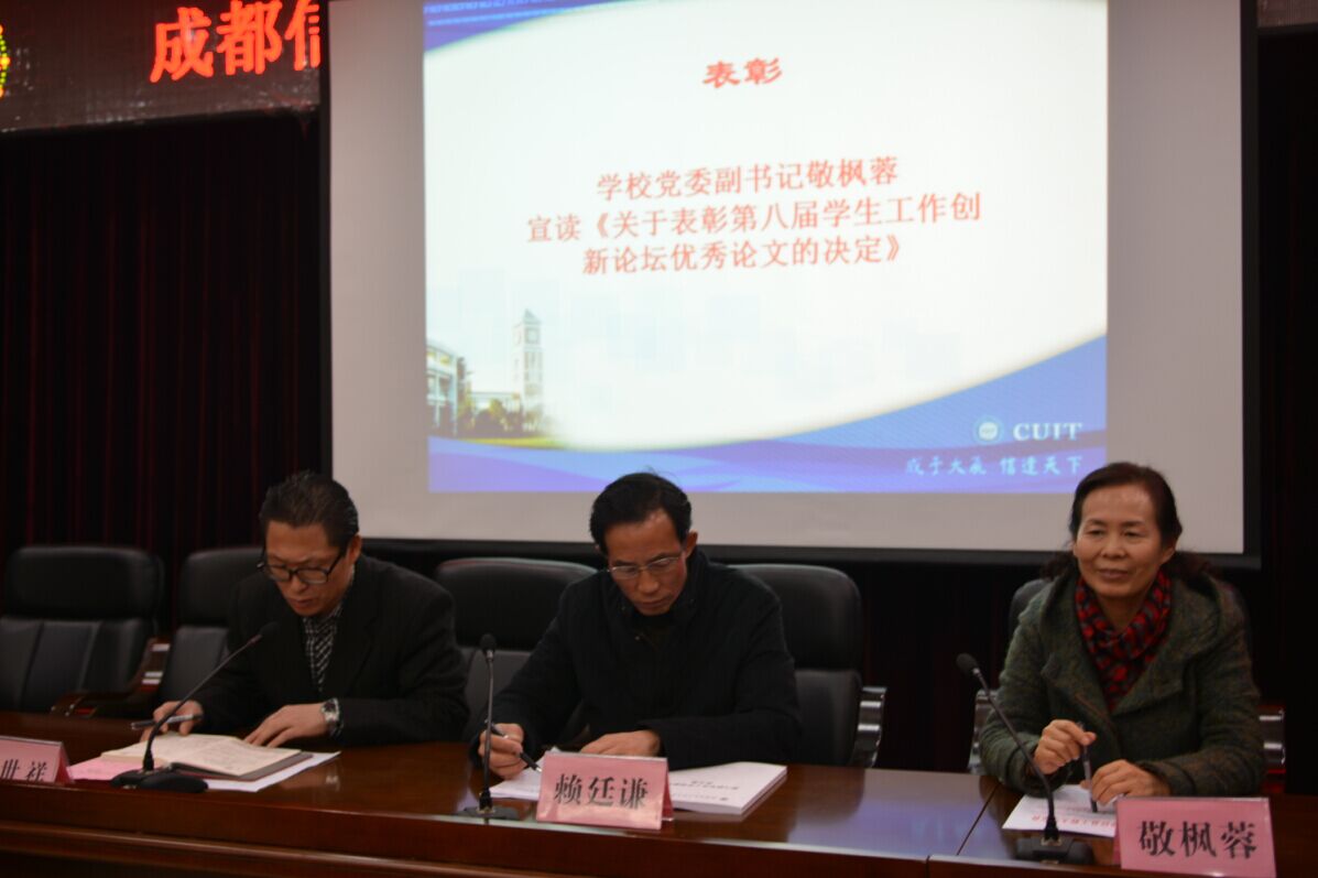 敬枫蓉宣读了《云博体育关于表彰第八届学生工作创新论坛优秀论文的决定》。我校2015年第八届学生工作创新论坛共收到36篇论文,论文主题广泛、涉及面广,密切关注学生工作中的新现象、新情况,并提出了新的解决方案。大会对刘全等撰写的《基于大数据的我国人才市场对高校毕业生素质能力需求的分析》等11篇获奖论文给予了表彰。