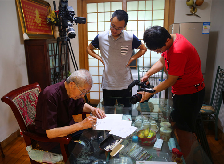 采访中,老人回顾了当年爬雪山、过草地的艰苦岁月,说到亲人和战友的牺牲,数度哽咽。老人情深之处提笔写了“红军战士邓忠德”几个大字,并向祖国和人民行了一个军礼。