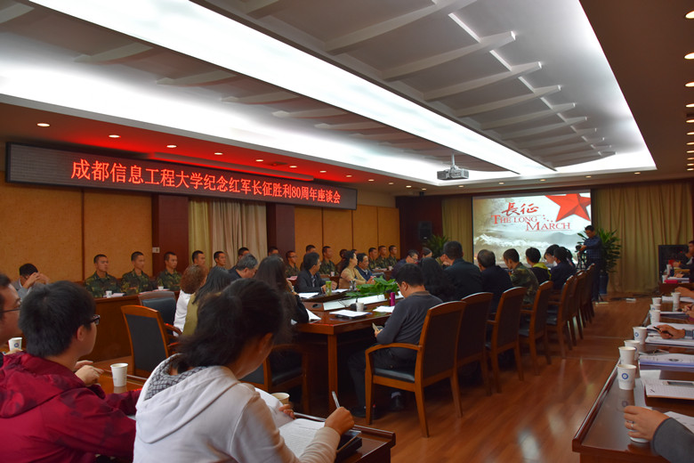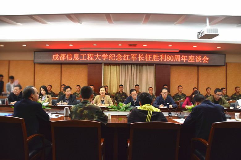 [本网讯]10月19日下午,学校在航空港校区第七会议室召开纪念红军长征胜利80周年座谈会,学校党委书记赖廷谦、副书记敬枫蓉、副校长于世祥,相关职能部门负责人,离退休教师代表、火箭军驻校选培办代表,民主党派及无党派人士代表,学生代表等80余人参加了座谈会,会议由敬枫蓉主持。