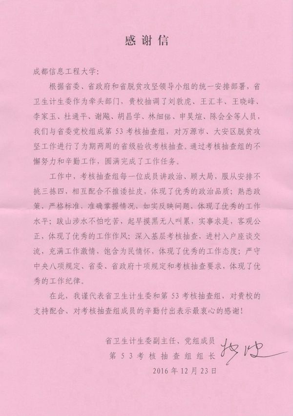 我校工作组成员本着实事求是、认真履职的高度责任感,白天走村入户,晚上汇总数据、讨论主要问题、撰写工作报告,克服了山高路远、坡陡路滑等困难,圆满完成了此次验收考核工作,并获得了工作组领导和地方党政领导的高度肯定(见感谢信)。
