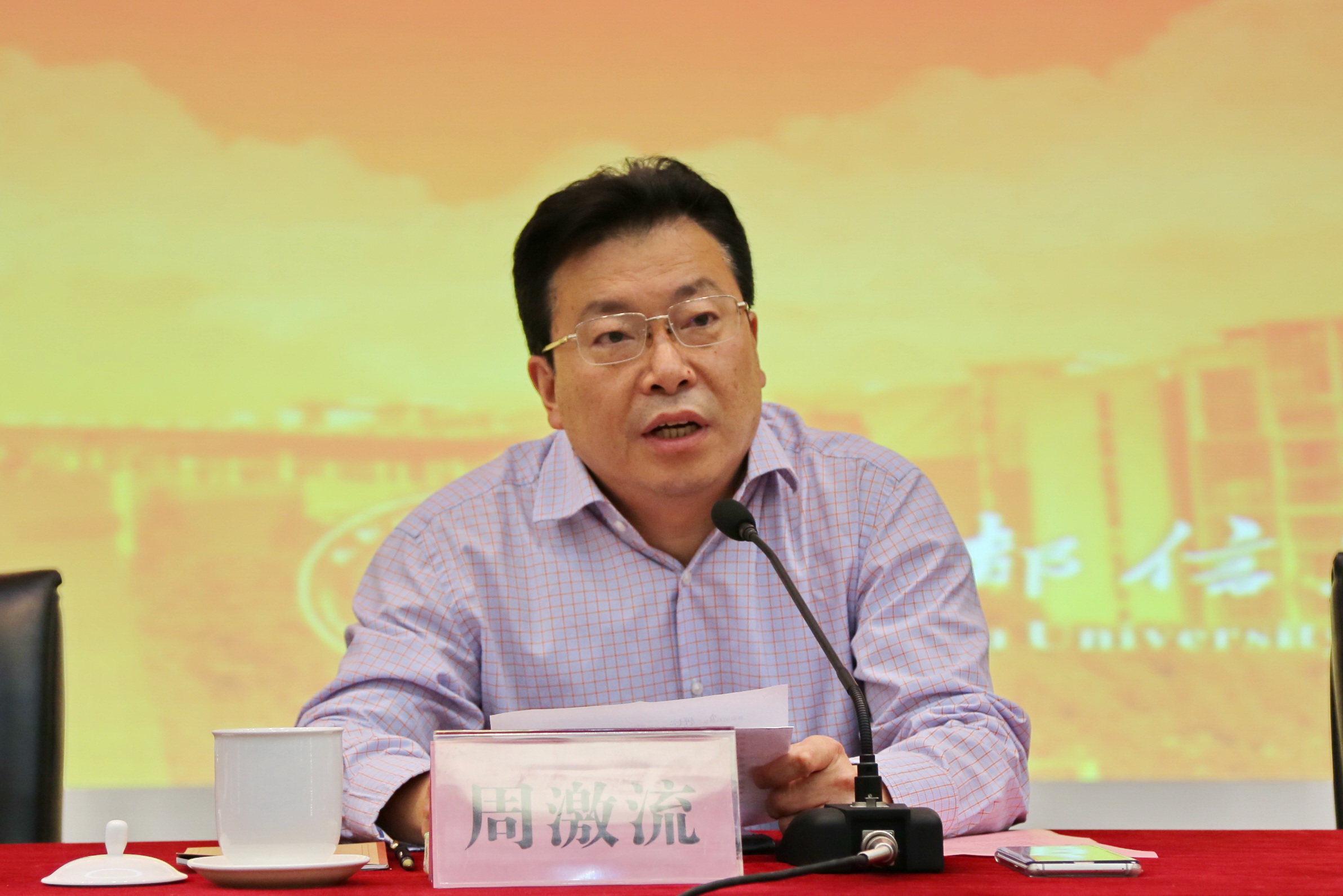 周激流在发言中感谢省委省政府的培养、关怀和信任,感谢全校干部师生的支持。他说,学校在66年的办学历程中形成了鲜明的办学特色,培养了大批优秀人才,在服务国家气象事业、信息产业、统计及国防现代化事业等国家战略以及区域经济社会发展中发挥了重要的作用。他表示,在今后的工作中,一定牢记使命,履职尽责,积极凝聚各方面的力量,把好方向、谋好大局、抓好大事、带好队伍、用好人才。他将带领学校班子成员和各级领导干部,将省委省政府对学校发展的新要求落实到学校的各项工作中,共同谱写建设开放的特色鲜明的高水平信息工程大学的新篇章。