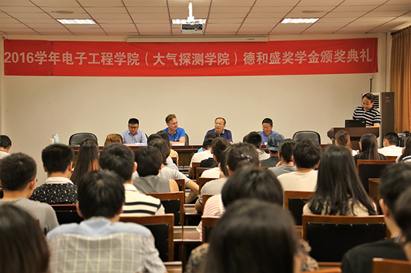 何建新在颁奖典礼上发表讲话,他对德和盛公司长期以来对学校的支持表示感谢。他说,德和盛公司从2010年开始捐赠社会奖学金给电子工程学院雷电专业的同学,至今已有7年,累计有60名同学获得该奖学金。每年,学院会安排奖学金获得者到德和盛公司进行实习,增长学生的学习实践经验,至今已有15名同学参加过实习。他希望电子工程学院继续加强校企合作,为在校学生创造更多的实践学习机会,在德和盛公司合作上再上新的台阶。