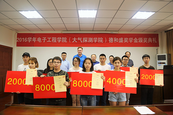 【本网讯】6月23日下午,2016年度德和盛社会奖学金颁奖典礼暨校企战略合作协议签字仪式在气象楼215会议室举行。德和盛电气(上海)有限公司总经理ALEXANDRE LICINA,产品管理、市场部门总监吴蕴岭,学校副校长何建新,学院党总支书记董一平、副书记杨勇、副院长孙秀斌、杜国宏,部分教师、学生代表参加了此次颁奖典礼。典礼由孙秀斌主持。