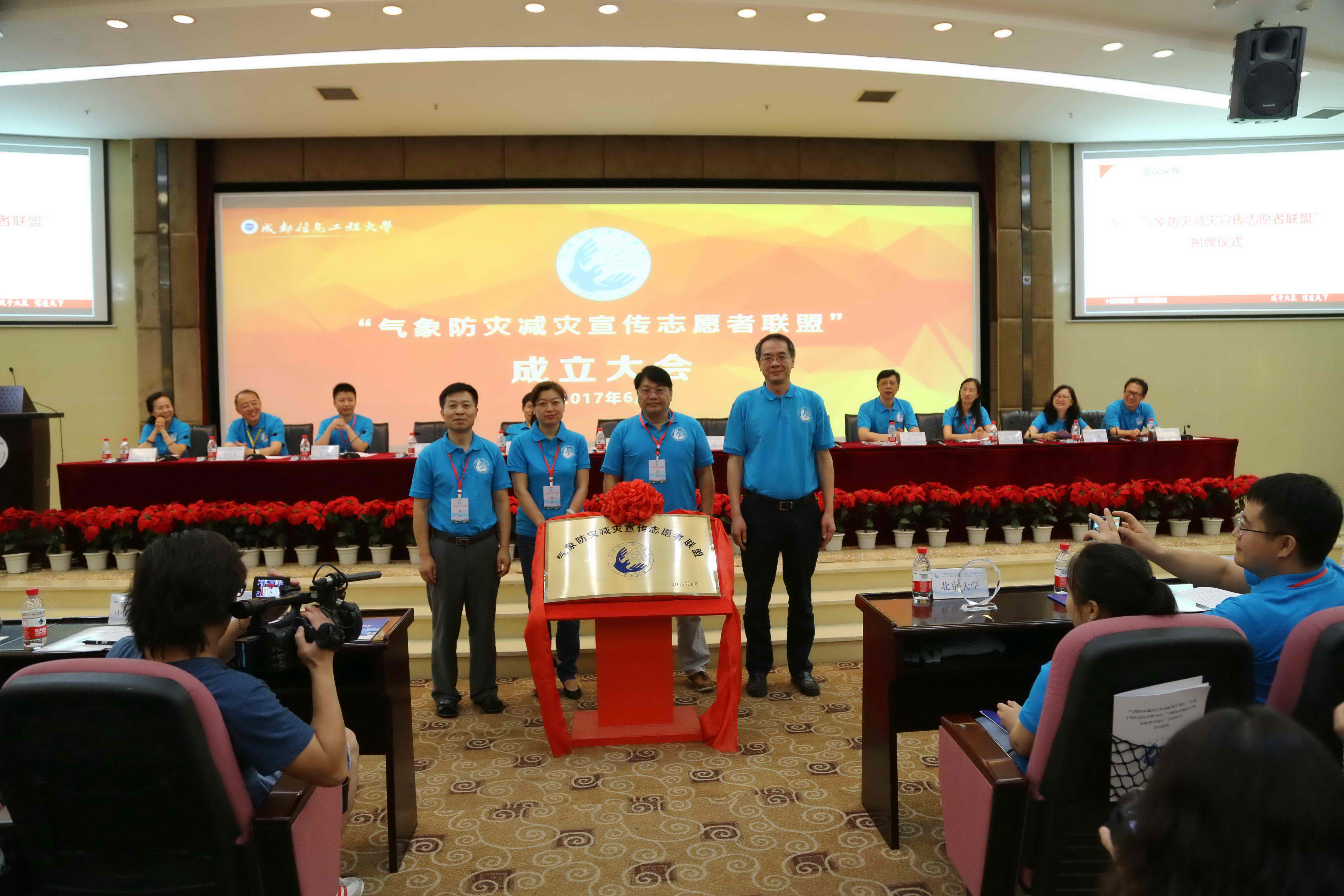 中国气象局办公室副主任洪兰江、中国科协科普部副部长钱岩、联盟理事长翟盘茂、云博体育校长余敏明为“气象防灾减灾宣传志愿者联盟”揭牌。