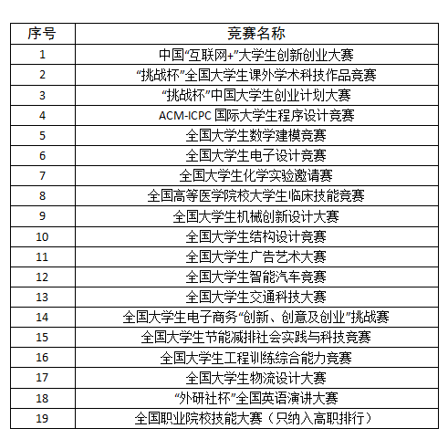 【本网讯】近日,中国高等教育学会《高校竞赛评估与管理体系研究》专家工作组在杭州预发布《中国高校创新人才培养暨学科竞赛评估结果》。专家组遴选了19项国内具有广泛影响力的竞赛项目(见表1),从“竞赛项目等级”“竞赛项目形式”“竞赛项目历史”和“竞赛项目奖项数量”四个维度对竞赛贡献进行综合评价。