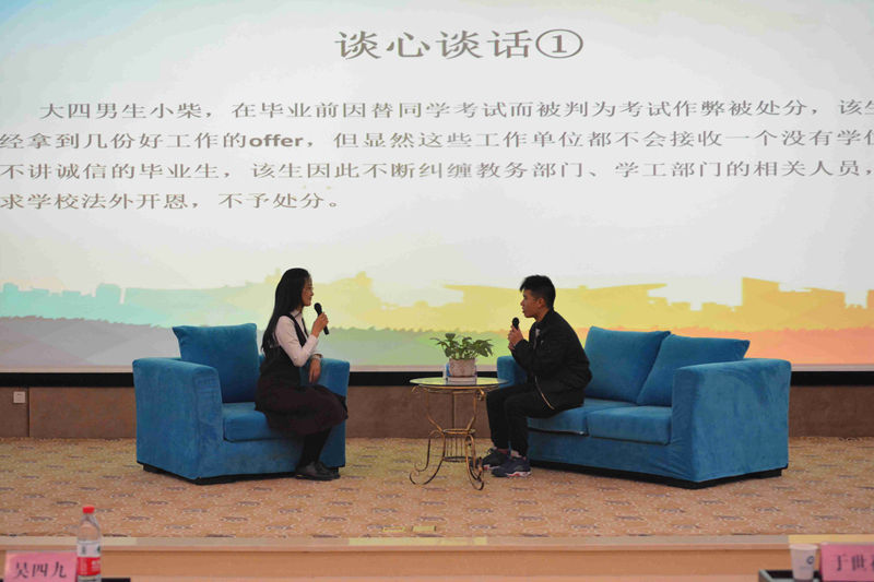 学生学业困难如何帮扶?学生因为自卑心理,与宿舍同学关系紧张如何缓解?学生对个人未来发展和时间管理感到迷茫,该如何指引?在最考验辅导员日常工作积累和随机应变能力的谈心谈话环节,助演同学们将一个个人物形象表演得淋漓尽致,真实的模拟了同学们在生活中存在的问题和需要帮助解决的困难。选手们现场抽题、临时准备,面对来自特殊学生的“刁难”,耐心聆听、得体应对,做到以情动人、以理服人,通过情景再现的方式展现了辅导员开展日常思想政治教育的多重视角。助演同学和辅导员老师的谈心“切磋”使得现场气氛高潮迭起,让现场评委和学院领导频频点赞。