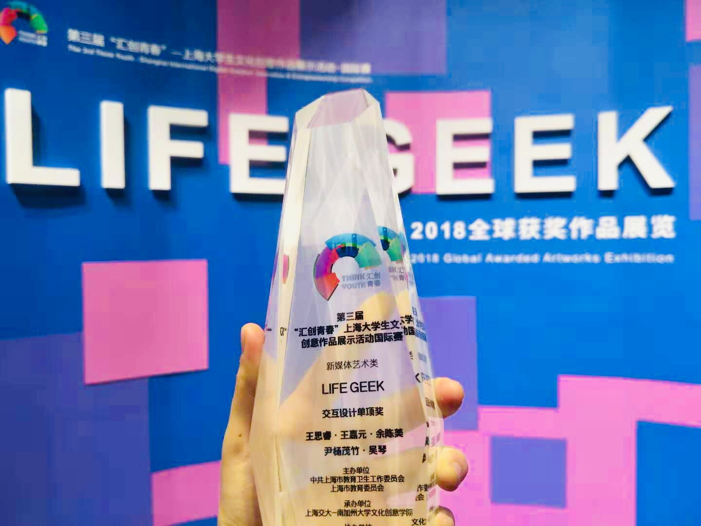 LIFE GEEK新媒体艺术奖作为汇创青春国际赛的一部分,代表了全新的艺术实践与颠覆性的创意实验,旨在吸引全球最优秀的科技与艺术创意型人才,汇聚科技与艺术、研究与实践、思维与创作,共同建立跨界交流协作的平台。本次LIFE GEEK吸引了来自全球500余件作品参赛,经过国内外新媒体艺术家的评选和微信线上投票的多轮评选,最终只选出了11件获奖作品,我校团队作品榜上有名。