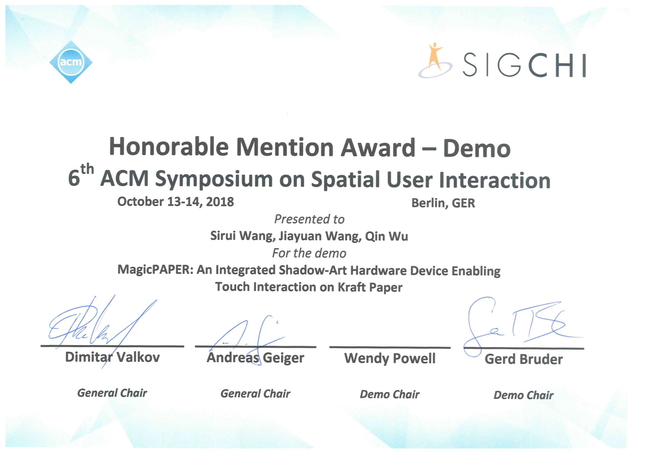 “MagicPAPER互动魔法书”项目获得SUI2018国际会议“最佳演示荣誉奖”
