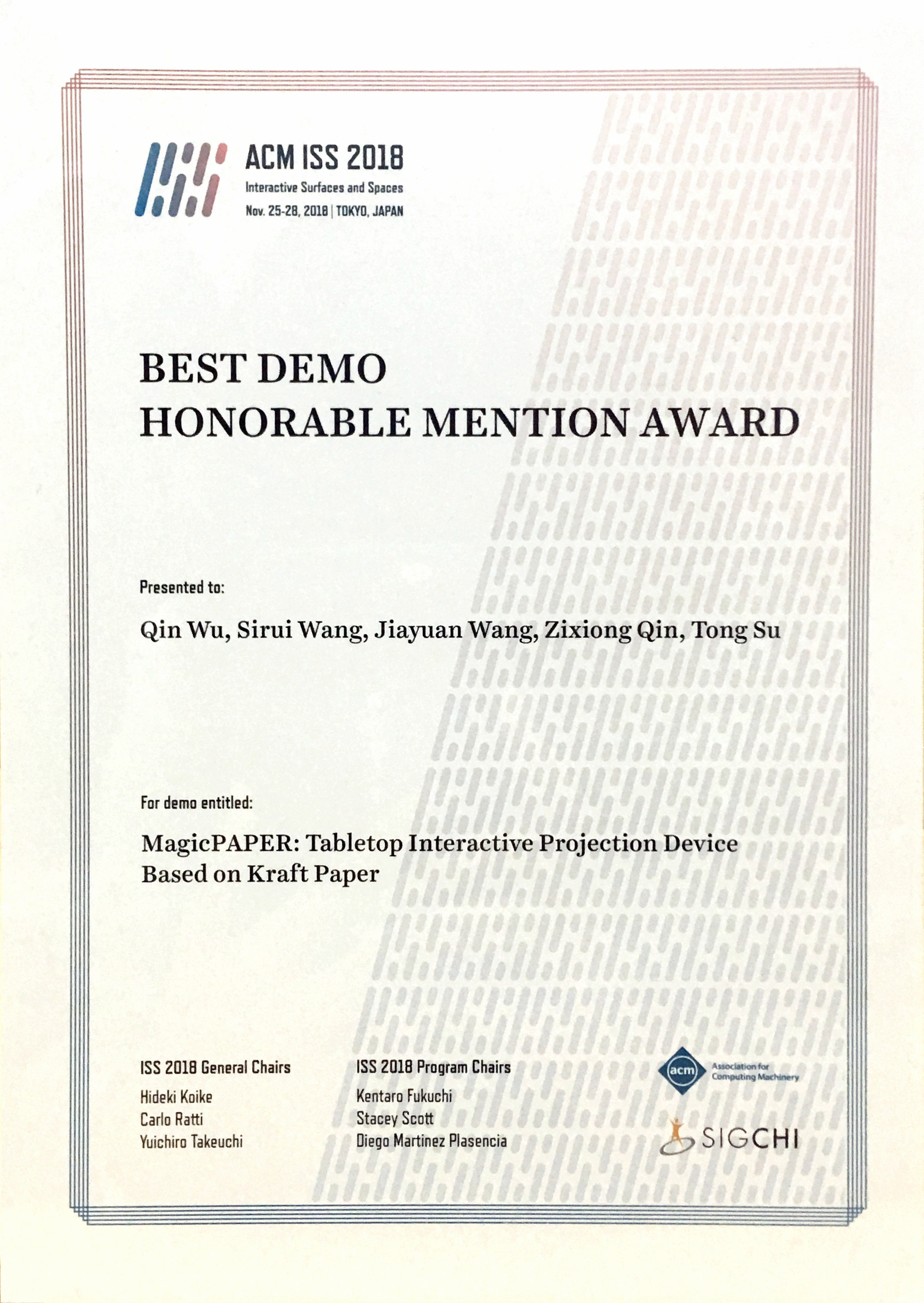 “MagicPAPER互动魔法书”项目荣获ISS2018国际会议“最佳演示荣誉奖”