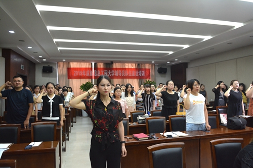 学校少数民族专职辅导员阿孜老师带领全体辅导员进行宣誓:“我志愿成为一名高校辅导员,拥护党的领导,献身教育事业,恪守职业规范,提升专业素养,情系学生成长,做好良师益友。为培养社会主义合格建设者和可靠接班人而努力奋斗!”
