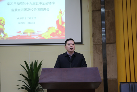 【本网讯】根据省委教育工委的统一部署,11月23日上午,学习贯彻党的十九届五中全会精神省委宣讲团高校分团走进云博体育航空港校区。省委宣讲团成员、四川省社会科学院副院长郑泰安研究员就党的十九届五中全会精神进行了深入宣讲。学校师生代表近300人到场聆听,宣讲会由省纪委监委驻校纪检监察组组长、学校党委副书记、纪委书记雷超主持。