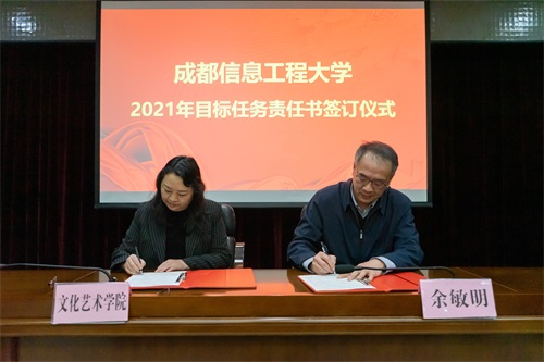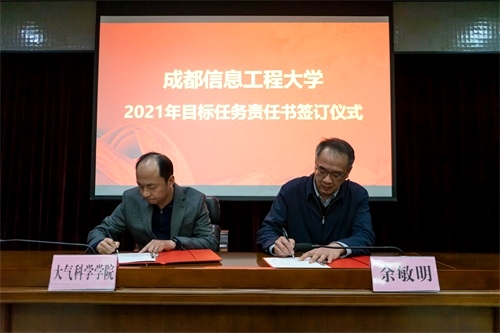 党委常委,党委组织部、党委统战部部长熊建主持了目标任务责任书签字仪式。余敏明代表学校同大气科学学院院长张宇、文化艺术学院院长廖思湄签订了《云博体育学院(中心、部)目标任务责任书》。其他学院的目标任务责任书将在会后陆续签订。