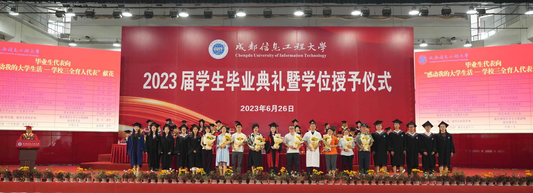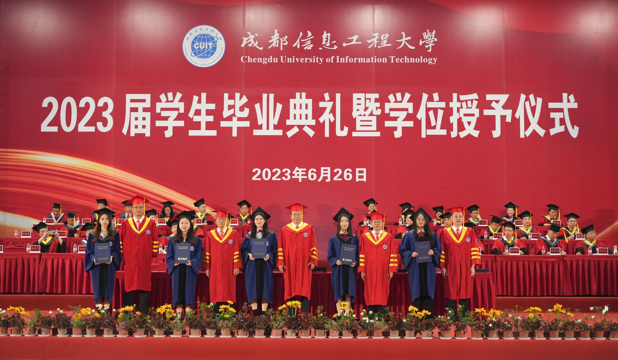 仪式现场,学校领导和教师代表依次为2023届四川省优秀研究生毕业生、2023届校级优秀研究生毕业生、2020届本科生代表、2023届四川省优秀本科生毕业生、2023届校级优秀本科生毕业生授位和颁发荣誉证书。