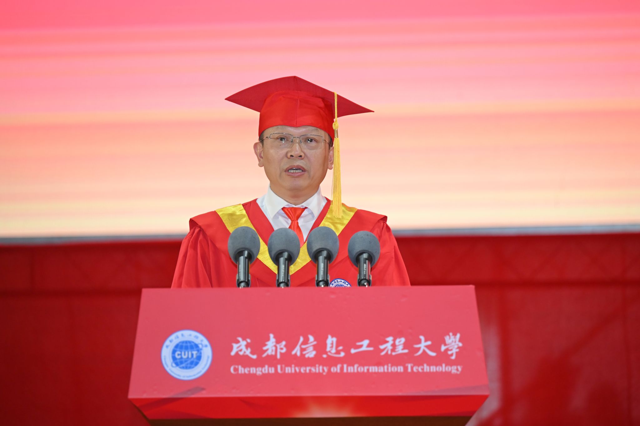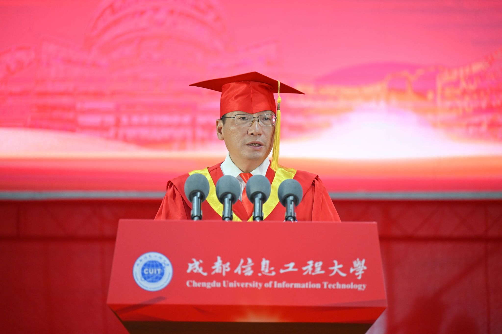 学校校长何建新教授以《心怀梦想前途阔 奋楫扬帆再启航》为题向2023届毕业生们送上了深情寄语。他代表全校师生员工,向毕业生们学有所成、焕新起航表示热烈的祝贺,诚挚欢迎往届毕业生返校代表,并向学生家长、广大教职员工和校友致以崇高敬意和衷心感谢。他赞扬了成信学子经历疫情展现出的自律奋进和在服务社会过程中彰显的勇毅担当,分享了国家、学校的变迁与改革发展,动情地讲述了与成信大风雨相伴、携手共进的40年爱校荣校的深厚情谊。他希望同学们志存高远,敢于筑梦。在人生规划中早立志、立大志,把个人梦想与党和国家的事业紧密相连,让理想信念在心中扎根,让青春在报效祖国、奉献社会、服务人民中增添奋斗的底色、拼搏的厚度;一往无前,勇于追梦。不负时代重托,以中流击水的气魄,朝着实现中国梦的宏伟目标奋勇前行;信念如磐,甘于守梦。把困难与挑战化作浇灌梦想的沃土,初心不改、矢志不渝,创造明天的辉煌;勤学苦练,善于圆梦。“非学无以广才,非志无以成学”,要顺应时代潮流,在学习中提升能力、增长才干、淬炼思想,在实践中锤炼品格、磨砺意志、善作善成,梦想终会照进现实。
