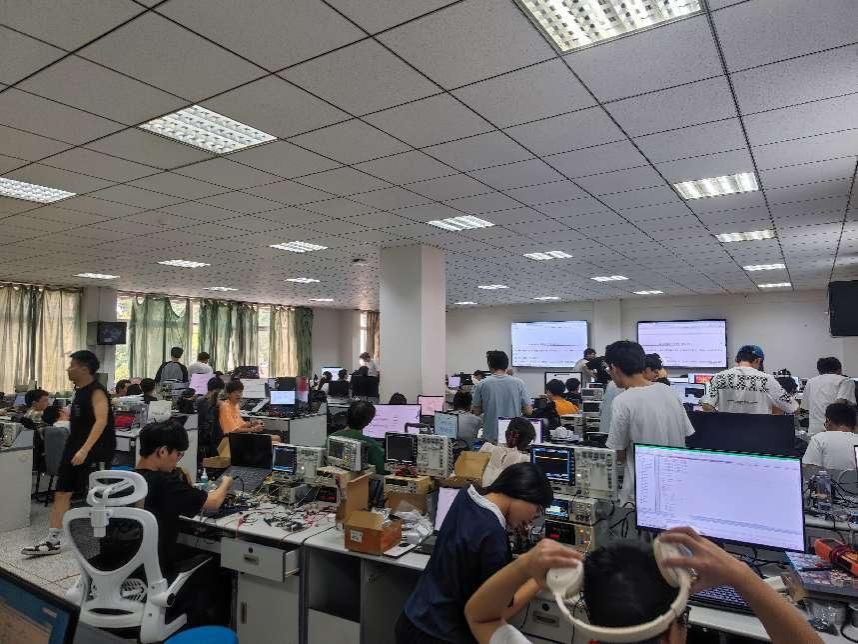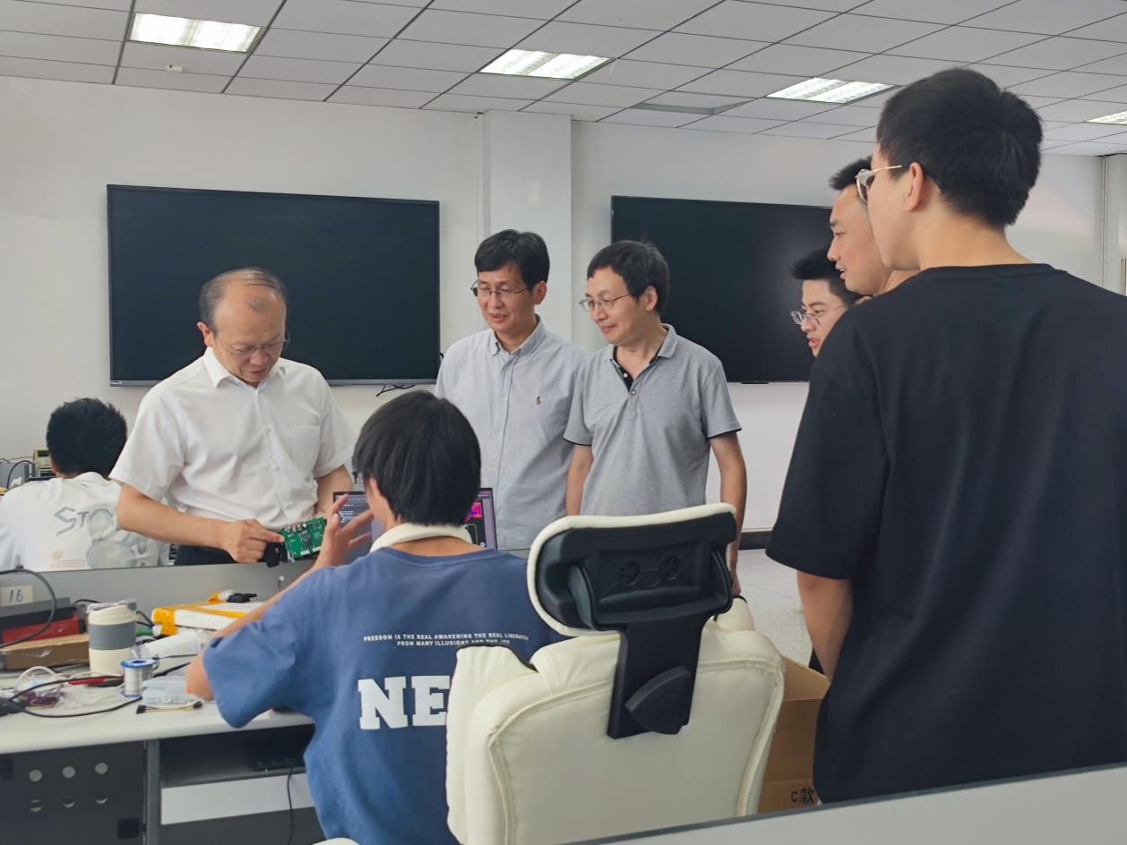 何建新一行来到工程实践中心,详细询问了参加2023年全国大学生电子设计竞赛的集训备赛情况,并和竞赛指导教师进行了深入交流,感谢他们牺牲假期时间全身心投入竞赛指导工作。在查看同学们的作品时,何建新从专业角度进行了指导点评,鼓励同学们大胆尝试创新,争取在竞赛中取得优异成绩。