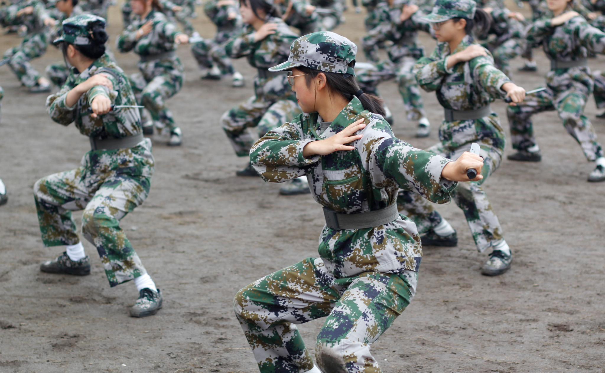 汇报表演伴随着《分列式进行曲》洪亮高亢的曲调拉开帷幕。各个参训的学生军训方阵统一身着迷彩服,他们迈着坚定整齐的步伐、喊着嘹亮的口号、斗志昂扬地走过主席台接受检阅。