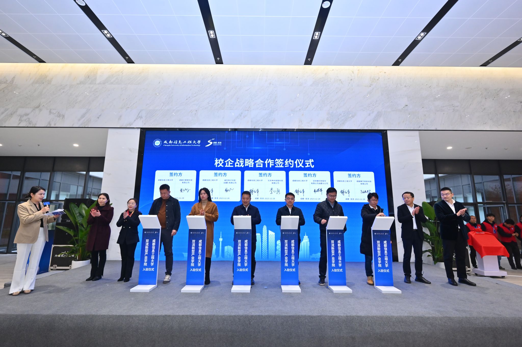 学校党委常委、副校长舒红平,党委常委、副校长罗小蓉,党委常委、宣传部部长张小红,双流区委常委、宣传部部长,成都芯谷发展服务局党组书记许敬,双流区委常委、组织部部长谭英华,双流区委常委、区总工会主席苏巍,四川省教育厅科学技术与研究生教育处处长贺羽、四川省科学技术厅高新处三级调研员王先进、四川省经济和信息化厅大数据与信息化处副处长丁涛、四川省知识产权服务促进中心创新处处长刘刚、四川省创新驱动发展中心主任缪建忠。学校党委办公室、校长办公室、党委宣传部(新闻中心)、学生工作处(党委学生工作部)、国内合作处(校友办公室)、研究生处、科技处(大学科技园管委会办公室)、校团委、双流产业学院管委会负责人,集成电路学院、网络空间安全学院、光电工程学院、区块链产业学院全体班子成员,双流区委办、区政府办、区委组织部、区委宣传部、区科技创新专班、成都芯谷发展服务局、区投促局、区新科局、区发改局、区教育局、空港科创集团、空港兴城集团等部门领导和新闻媒体参加了仪式。