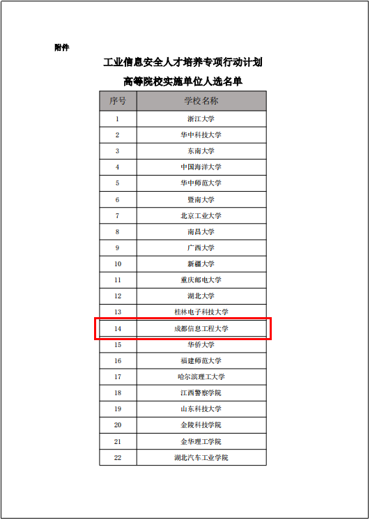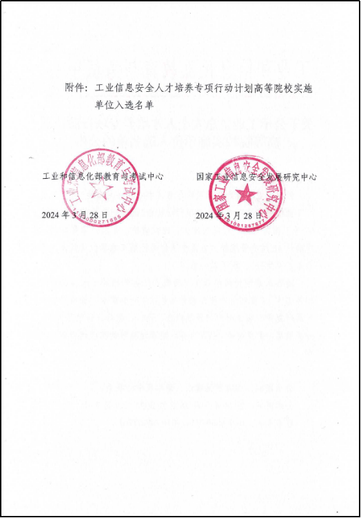 我校网络空间安全学院会同教务处、科技处、发展规划处组织申报,于2023年11月提交申请,2024年2月通过答辩,3月学校正式入选首批“工业信息安全人才培养专项行动计划”。一同入选的有浙江大学、华中科技大学、东南大学等高校。入选院校将围绕工业信息安全领域,开展产业人才研究、产业人才评价、人才培养体系建设、服务平台搭建、实训基地建设、高水平师资队伍建设,技能大赛组织、产业社会化服务、科研创新等工作,深化产教融合、科教融汇,促进产业高质量快速发展,支撑制造强国、网络强国等国家战略落地。