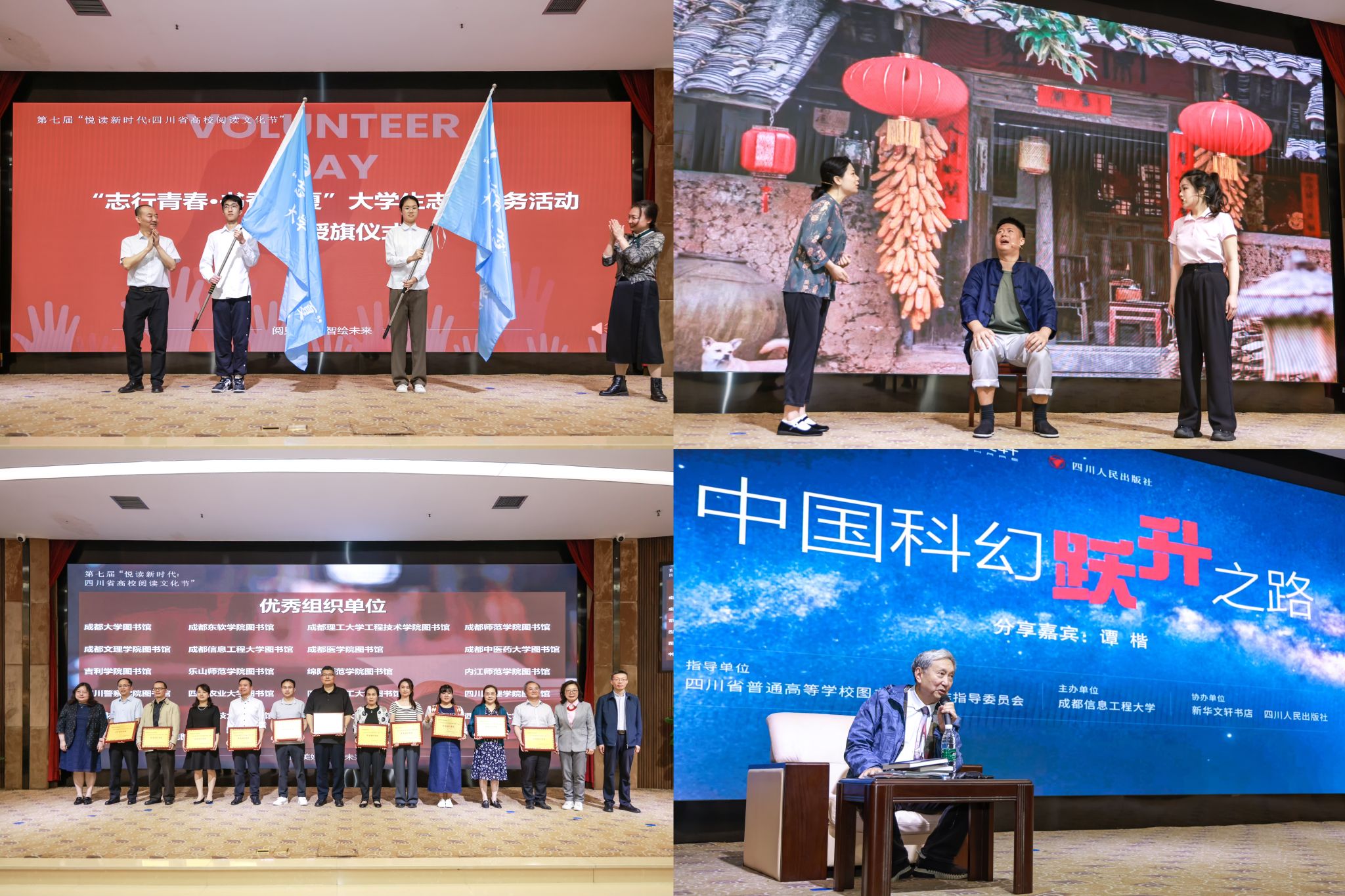 现场发布了第七届“悦读新时代:四川高校阅读文化节”主题及内容,举行了“志行青春·书香蜀夏”志愿服务活动启动授旗仪式、2023年四川省大学生信息素养大赛颁奖仪式。我校学生进行了“立体阅读”作品《向天要借丰收雨》展演。特邀专家、原《科幻杂志社》总编谭楷先生以《中国科幻跃升之路》为题开展了讲座。