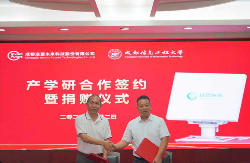 舒红平和邓思华代表双方共同签署产学研合作协议。成都远望未来科技股份有限公司为学校捐赠大功率高精度X波段双偏振有源相控阵天气雷达(1000万元)以及现金50万元。
