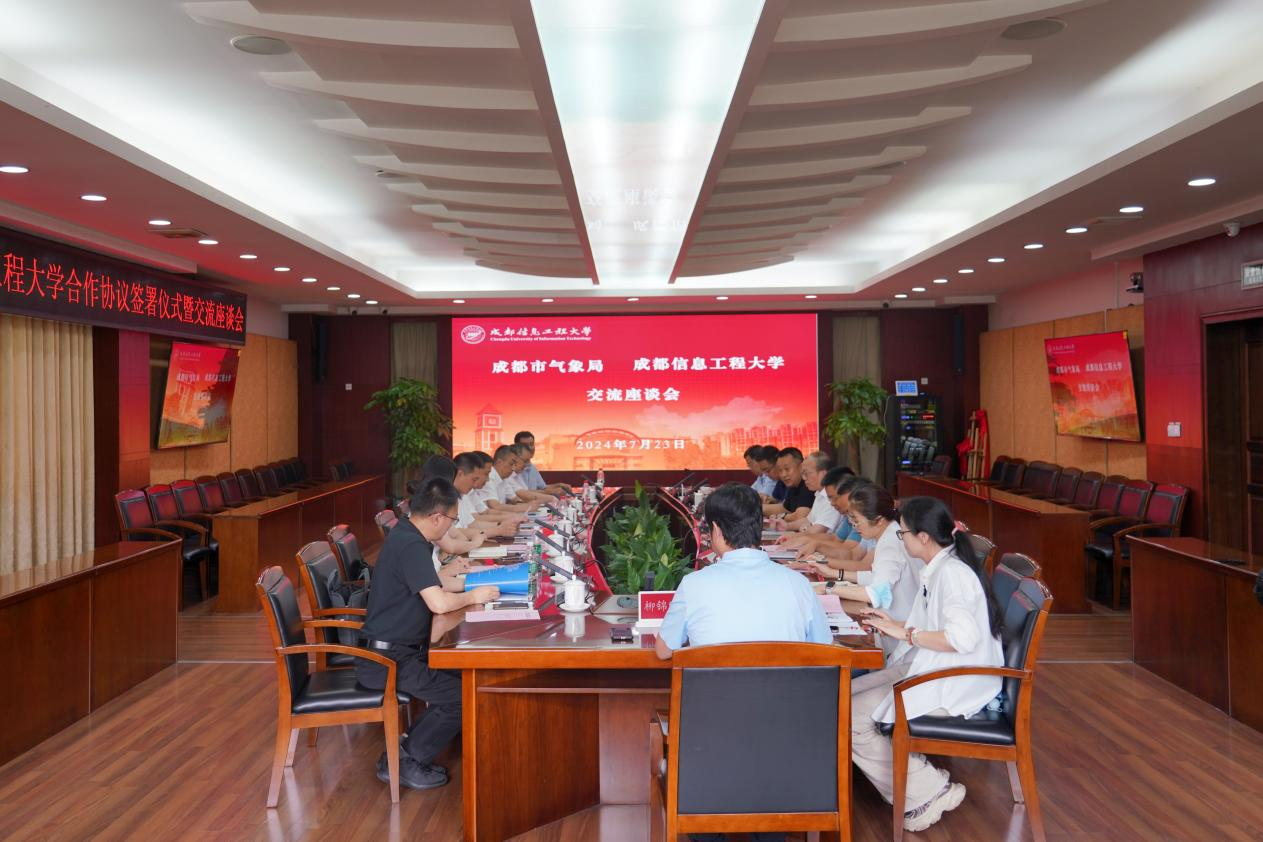 成都市气象局办公室、业务处、人事处、气象台、气象探测与信息中心、环境气象中心,我校党政办公室、人事处(党委教师工作部)、科技处(大学科技园管委会办公室)、大气科学学院、电子工程学院(大气探测学院)、光电工程学院的主要负责人参加了交流座谈。