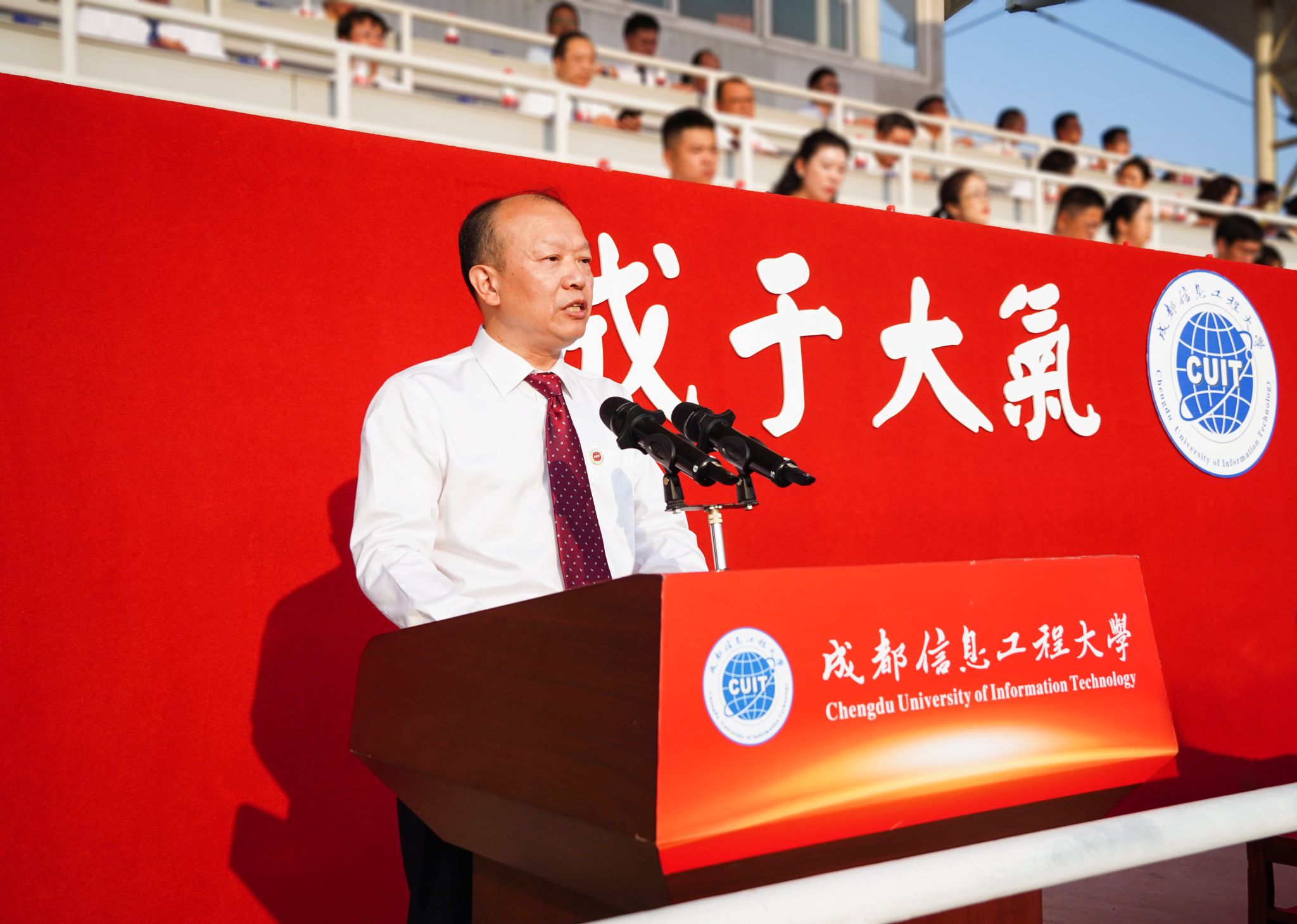 【本网讯】长空旭日蓄势待发,成信学子昂扬振奋。9月2日清晨,学校2024级新生开学典礼暨军训动员大会在航空港校区第二田径场和龙泉校区大礼堂盛大举行。大会现场两校区活动盛况网络同步直播。学校领导,相关职能部门负责人,各学院党委书记(副书记)、院长,2024级学生辅导员,2024级全体学生参加典礼。学校副校长陈权亮主持开学典礼。