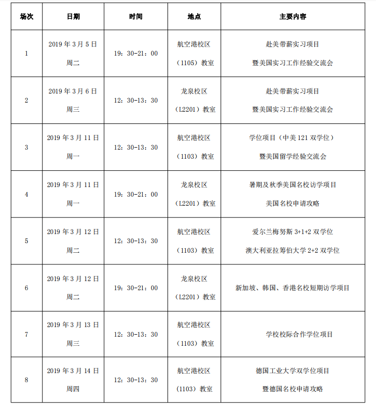 为了让我校学生更充分了解学校出国(境)留学项目,加深对学校出国留学相关政策和选拔流程的理解,鼓励更多优秀的学生赴海外院校学习深造,国际交流与合作处将于3、4月集中为广大学生进行政策解读并邀请我校有留学经历的学生做经验分享,欢迎有意留学海外的同学们积极参加宣讲会。现将宣讲会具体安排通知如下: