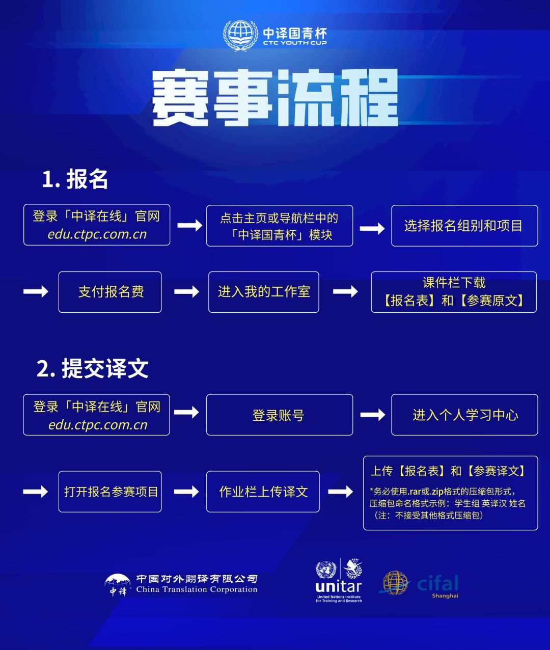 6.“参赛译文”和“报名表”两份文件需打包在同一格式为.zip或.rar的压缩包中同时上传,压缩包命名示例:学生组 汉译英 张三;