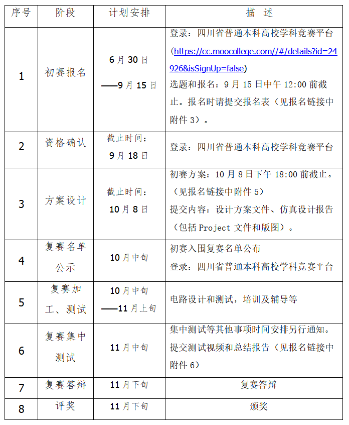 2、竞赛分为初赛(方案设计)和复赛(实物制作、测试、报告和答辩)两个环节进行。
