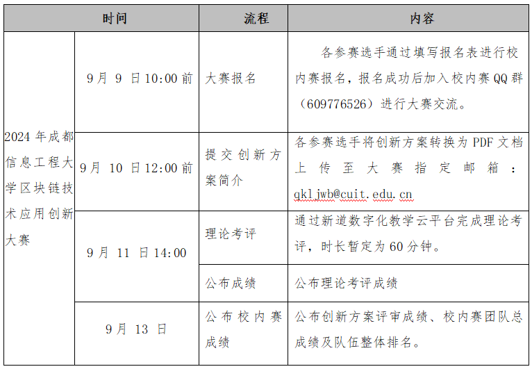具体事项详见《2024年四川省大学生区块链技术应用创新大赛暨川渝大学生区块链技术应用创新大赛校内选拔赛竞赛方案和通知》附件。