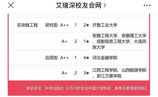 【本网讯】近日,全国第三方大学评价机构艾瑞深校友会网撰写完成、科学出版社即将出版发行的《2023校友会中国大学排名:高考志愿填报指南》中,最新发布了校友会2023中国大学区块链工程专业排名,我校区块链工程专业排名全国第二,评为A+级。