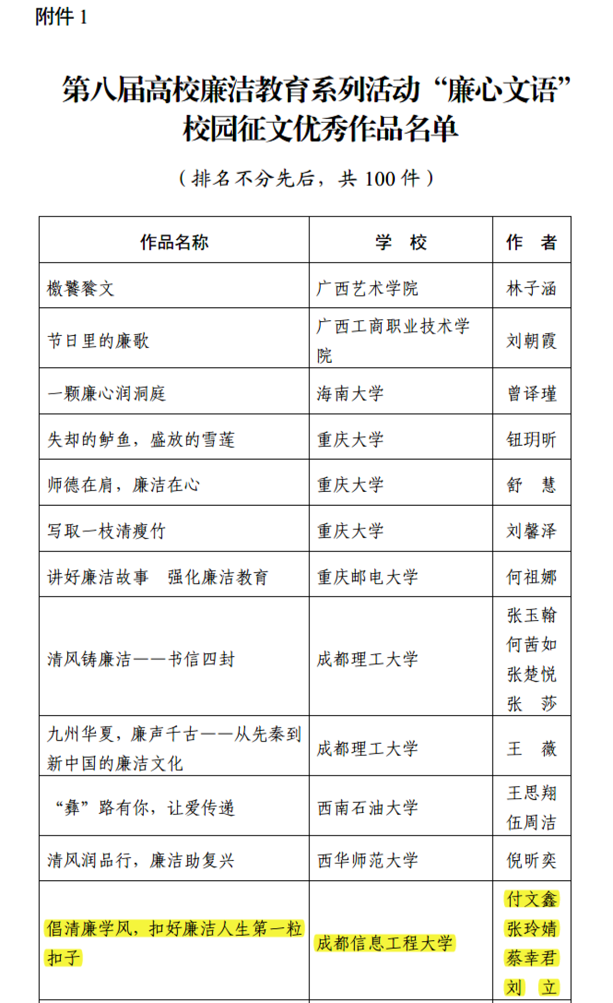 【本网讯】近日,由教育部办公厅主办的“廉洁润初心 铸魂担使命——第八届高校廉洁教育系列活动”评选结果公布,由学校纪委牵头报送的“清廉校园APP项目”被评为案例展示优秀作品,由我校党委宣传部推荐报送的征文作品《倡清廉学风,扣好廉洁人生第一粒扣子》被评为校园征文优秀作品,入选项目数位列四川省内高校第三。