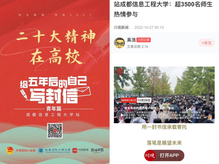 【本网讯】近日,由中央网信办主办的2022中国正能量网络精品征集展播活动揭晓结果,经过初选、专家审核评议、网络展播投票、终选以及结果公示,学校团委联合团省委、川观新闻共同开展的《给五年后的自己写一封信》活动获评“中国网络正能量主题活动”精品。