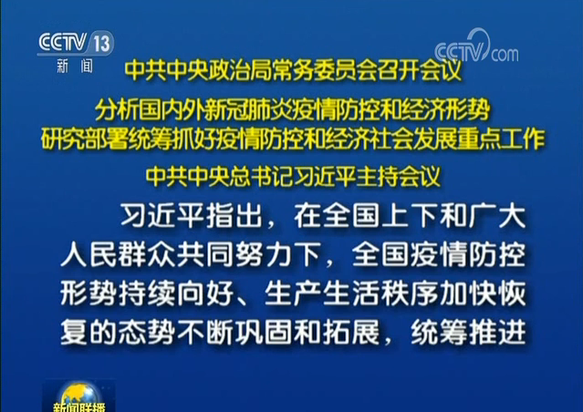 习近平指出,在全国上下和广大人民群众共同努力下,全国疫情防控形势持续向好、生产生活秩序加快恢复的态势不断巩固和拓展,统筹推进疫情防控和经济社会发展工作取得积极成效。同时,我们也面临着不少新情况新问题,特别是境外疫情扩散蔓延及其对世界经济产生不利影响,也给我国疫情防控和经济发展带来新的挑战。要准确把握国内外疫情防控和经济形势的阶段性变化,因时因势调整工作着力点和应对举措,确保打赢疫情防控的人民战争、总体战、阻击战,确保实现决胜全面建成小康社会、决战脱贫攻坚目标任务。