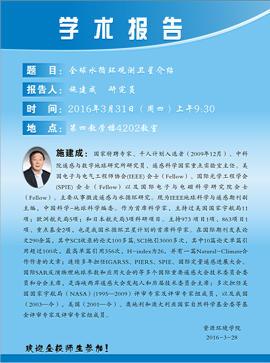 上一条:遥感科学国家重点实验室主任施建成研究员受邀来学校作学术讲座