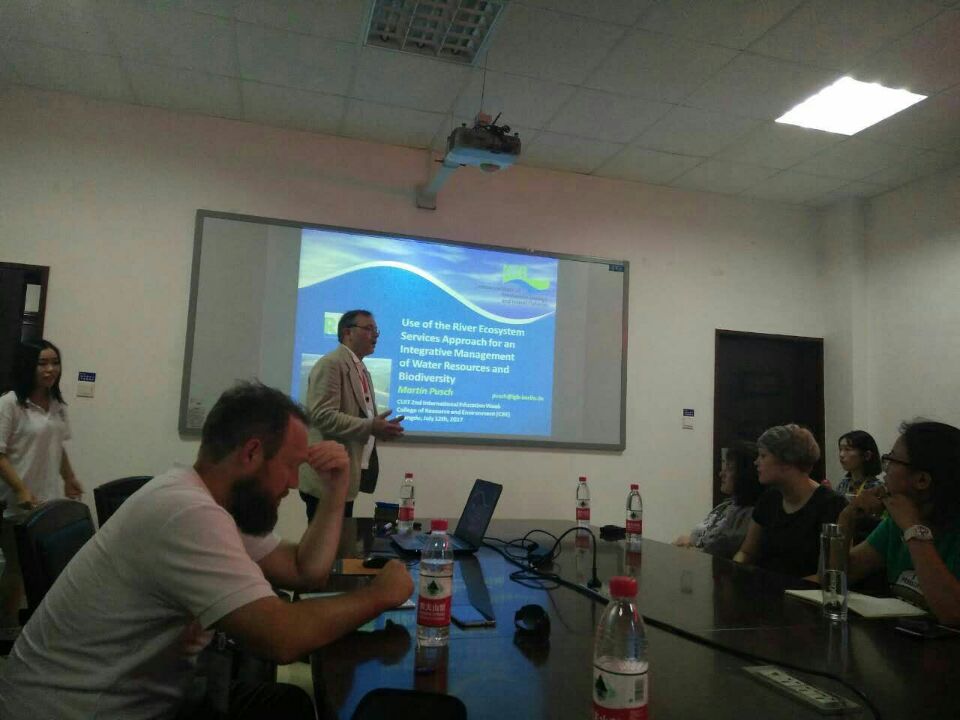 Martin Pusch博士说他非常珍惜这次和资环学院的同学们交流和学习的机会。他希望大家能在短短一周内,以一种轻松且自信的心态完成所有课程,也希望同学们能畅所欲言、积极提问。课堂上,他为同学们讲解了一些水化学、水资源的综合管理办法方面的具体实例。Markus Koeck博士从环境风险、风险的计算、风险的管理等方面展开了全方位的讲解,给同学们留下了非常深刻的印象。